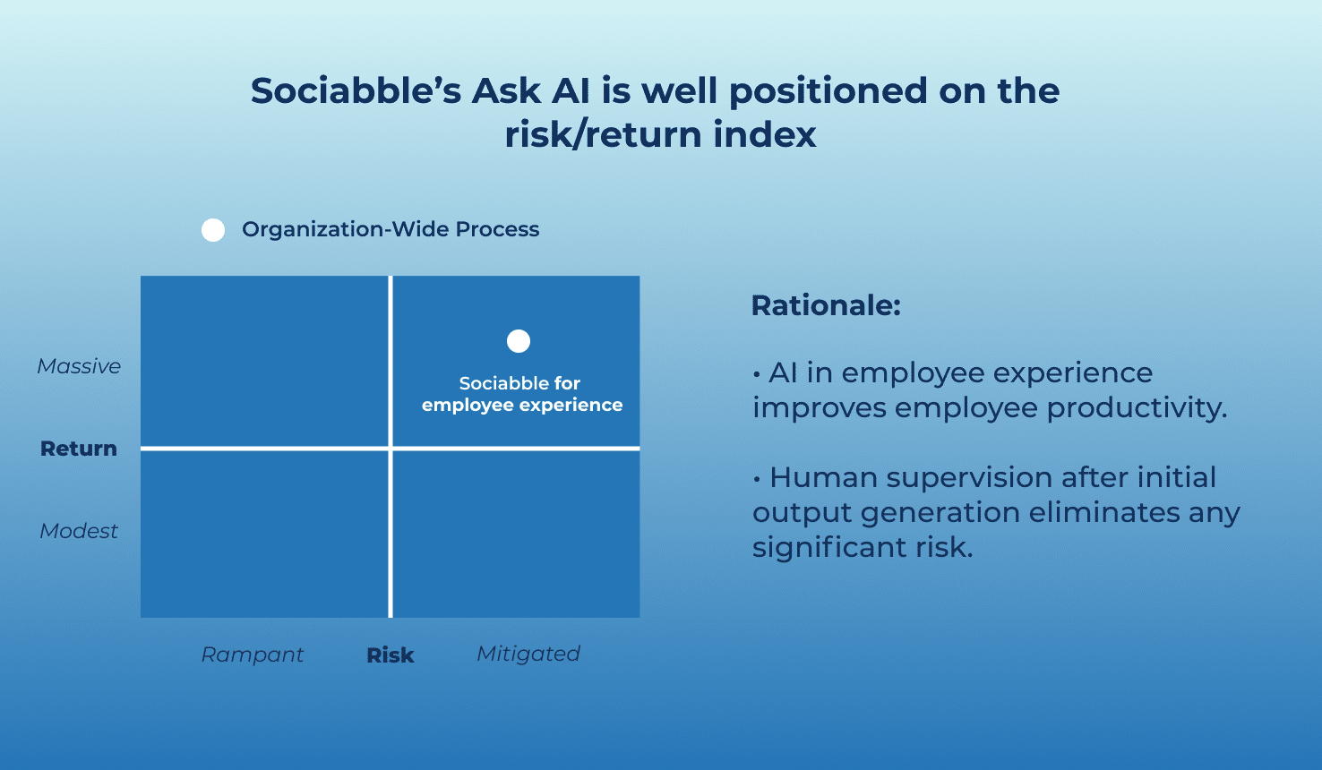 Scroll down Level up! Close Schedule your demo Want to see Sociabble in action? Our experts will answer your questions and guide you through a platform demo. It may sound cliché, but it’s undeniably true: when it comes to AI, the future is now. Artificial intelligence is no longer a distant tech promise, but a crucial part of modern business. It’s here, shaping how employees communicate, collaborate, and engage every day. But with that truth comes a certain complexity. With so many solutions flooding the market, decision-makers are forced to ask: which tools truly add value, and which are just hype? Which is precisely why independent endorsements matter so much. When INFO-TECH Research Group, a leading IT advisory firm, recently evaluated AI solutions for employee engagement, their recommendation was clear: Sociabble’s Ask AI stands out as a top choice for medium and large enterprises. So, what makes Ask AI different? And why are organizations like AXA and Generali already seeing results? Let’s dig into the report and find out. The Engagement Challenge Companies Can’t Ignore Engaging employees has always been tough, but today’s workplace adds new layers of complexity. Hybrid models, rapid digital transformation, and shifting employee expectations have stretched traditional communication tools to their limit. Leaders now face the dual challenge of keeping employees informed while making them feel recognized and connected. Needless to say, it’s not an easy task. The INFO-TECH report outlines the most pressing obstacles companies encounter today: Ineffective communication. Siloed environments and hybrid work make it harder to keep employees informed in real time. Weak recognition. Employees often feel their contributions go unnoticed, which erodes motivation and retention. Isolation and disconnection. Remote staff, in particular, report feeling cut off from company culture. Onboarding and enablement gaps. Many new hires lack the tools and training they need to thrive quickly. Limited feedback loops. Organizations struggle to collect and act on employee feedback in a timely way. The result? Lower engagement, wasted productivity, and cultural drift. Left unchecked, these issues can affect not only morale but also bottom-line performance. The Solution: Sociabble’s Ask AI Sociabble, already recognized as a leader in employee communication and engagement, has taken a bold step by embedding AI directly into the employee experience. Unlike standalone AI tools, Ask AI isn’t just a shiny new feature: it’s built into the platform to enhance how employees, communicators, and managers connect and collaborate. The goal isn’t to replace human creativity, but to accelerate it and make communication seamless across the entire organization. Here’s how Ask AI transforms the employee experience: AI-Powered Content Creation. Whether drafting an internal announcement, preparing a leadership update, or brainstorming social content, Ask AI provides context-aware suggestions that reflect company tone, values, and compliance requirements. Social Media Content Generator. Employees can easily share curated, compliant posts on LinkedIn or other networks, turning advocacy into a natural extension of their work. AI-Powered Search & Summarization. No more wading through endless documents or long meeting recordings. Ask AI aggregates content, translates updates into multiple languages, and summarizes video calls or transcripts into digestible takeaways. Efficiency Templates. From event invites to social campaigns, ready-to-use AI templates speed up everyday communication tasks. By automating repetitive, low-value work, Ask AI frees employees to focus on high-value contributions, making it easier for them to participate in the company conversation. Proof Points from INFO-TECH As you’ve probably noticed, practically every vendor promises ROI. It’s always a selling point. But independent validation is what truly makes the difference. INFO-TECH’s research doesn’t just highlight theoretical benefits; it measures real-world outcomes reported by clients. The data confirms that Ask AI consistently delivers meaningful impact on both productivity and employee engagement. Such findings include: Efficiency gains of 20%. Clients reported significant time savings in drafting announcements, summarizing calls, and creating social posts. Rapid ROI. With a payback period of under 12 months, and in some cases as fast as 3 months, Ask AI delivers measurable value. High satisfaction. Clients rated the platform a 10/10 Net Promoter Score, reflecting both ease of use and business impact. Minimal risk. Built with ISO 27001 and GDPR compliance, Sociabble ensures enterprise-grade security and privacy, a non-negotiable for CIOs. Enterprise-ready. INFO-TECH specifically recommends Sociabble for medium and large enterprises, positioning it as a scalable solution for complex organizations (p. 18). Strong risk/return profile. On the INFO-TECH risk/return index (p. 15), Ask AI sits firmly in the high-return, low-risk quadrant, reflecting its ability to boost productivity without exposing organizations to undue risks. Put simply: Ask AI offers both business upside and peace of mind. Customer Voices: Real-World Validation Numbers are important, but human experience is just as telling, and sometimes even more so. The true test of a solution is whether employees and leaders find it valuable in their day-to-day work. That’s why client voices from AXA and Generali are so compelling. They show how Ask AI translates into real-world benefits. At AXA, Audrey Brahim, Head of Corporate Communication, summed it up: “I’m always impressed with [Sociabble’s] capacity of innovation. First, they really have a good product. It works, it’s simple, and not all companies can say that.” At Generali, the impact is felt on the ground: Bruno Kaltenbrunner, Head of Sales Systems & Digitalization: “It’s not so easy to write your tex