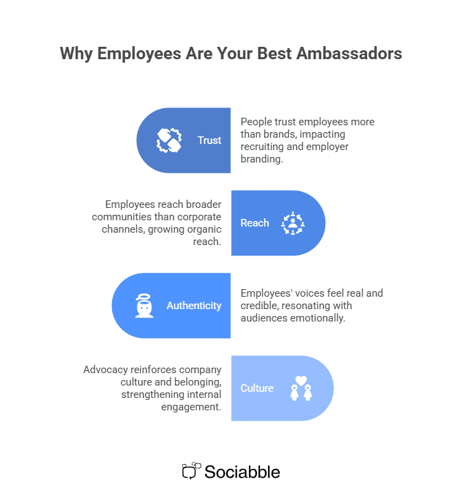 The most trusted voices talking about your company are not your executives or your traditional marketing team. They are your employees. In a world where audiences scroll past polished corporate messages, an employee advocacy program has become one of the most reliable levers for reach, credibility, and employer brand building. Yet most companies struggle to activate existing employees in a meaningful, sustained way. They want brand ambassadors, but they default to ad hoc campaigns, unclear guidance, or incentives that feel disconnected from reality. This article explains what an employee brand ambassador truly is, clarifies why when employees promote a brand they outperform corporate channels, and it outlines twelve practical steps to turn everyday collaborators into confident and motivated brand advocates. We will also explore how to measure success when employees feel connected, and highlight moments where a platform like Sociabble naturally strengthens your social media strategy. What Is an Employee Brand Ambassador? An employee brand ambassador is someone who represents, promotes, and advocates for their company because they genuinely believe in its mission, brand values, and work. This is not a scripted promotional role. It is a voluntary expression of pride and alignment that carries more weight precisely because it feels real. Employee ambassador programs humanize your brand identity by sharing stories, reflections, and experiences that resonate far more than corporate messaging. A social media post about a meaningful project, a behind the scenes moment, or a simple explanation of why someone loves their work can outperform your official channels in both engagement and authenticity. Employee ambassador programs contribute to multiple strategic objectives. They strengthen employer branding, support recruitment, build thought leadership, help sales teams through social selling, and reinforce company culture. Crucially, ambassadors come from every corner of the organization. A frontline worker, an engineer, a manager, or an intern can all serve as powerful advocates. What matters is not seniority. It is authentic advocacy that is rooted in company values. Why Employees Are Your Best Ambassadors Trust today flows horizontally between people, not top down from brands. Employees influence their online peers, it’s simply a fact. This simple reality explains why an employee advocacy program works so well. 1. People trust people more than brands Research consistently shows that audiences trust regular employees more than official spokespeople or advertisements. When interested employees speak, readers perceive sincerity. This has a direct impact on recruiting and employer branding. Readers often engage with employee stories before they ever explore corporate pages, which is why they rank so highly as part of employer brand strategy. 2. Their professional networks are broader and more diverse Collectively, employees reach communities you cannot access through corporate social media channels. That includes alumni groups, former colleagues, specialized industry circles, and local communities. Organic reach grows exponentially, something regularly discussed in guidance on social selling and social media influence. 3. Their voices feel real and credible Authenticity is what people respond to. When employees share enthusiasm for a training opportunity, a sustainability project, or a customer success story, it feels grounded and human. Corporate messaging rarely has the same emotional impact. This difference is why many brands now encourage employee generated content as part of their larger comms strategy. 4. Advocacy reinforces company culture and belonging When employees feel proud to represent their company publicly, it strengthens internal engagement. An employee advocacy program creates a sense of shared purpose and reinforces cultural strengths. This dynamic also aligns with long term advocacy efforts to build a stronger company culture, one that gets employees excited to champion it. 12 Best Practices to Turn Employees into Brand Ambassadors Employee advocacy does not succeed on enthusiasm alone. It requires clarity, structure, incentives, and ongoing support. These twelve practices reflect what consistently works across global deployments. 1. Start with a Clear, Inspiring Narrative Employees must understand what the company stands for and how their work contributes to that mission. A coherent narrative backed up by simple social media guidelines helps them speak confidently and consistently. Without one, employee advocacy risks becoming scattered or inconsistent when advocating on their social media platforms. They need to understand the central mission and core values, as well as the guidelines built around how to communicate them to the general public. 2. Secure Leadership Sponsorship When leaders share company content or comment on employee posts, they normalize employee advocacy. Their visibility removes hesitation and signals permission. This can be as simple as executives publishing reflections on internal communication trends or celebrating team accomplishments. Encourage them to be involved, to comment, reshare, and create content as well. They will set the tone! Also read:From Discreet B2B to Visible Leader Advocacy – The Framatome Case 3. Define the “What’s in It for Me?” Employees engage when they understand how employee advocacy benefits them. That includes personal branding, skill development, visibility, networking opportunities, and thought leadership. Hold seminars and training sessions that clearly explain the benefit, laying out the ways it will help their online persona as well as their career overall. It’s not just good for the company, but also helpful for their long-term goals. 4. Provide Ready to Share, High Quality Content Employee advocacy must feel easy. Employees should have access to curated stories, articles, videos, and employer branding content. 