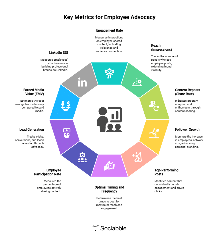 Many companies invest time and budget into employee advocacy programs, hoping to turn their workforce into powerful brand ambassadors. But there’s one common stumbling block: measuring impact. Without analytics, employee advocacy can feel like a black box: full of potential, but impossible to prove. And that’s a problem. If leaders can’t show results with the right critical metrics, they struggle to secure executive buy-in, optimize content strategies, or motivate employees to keep participating. Employee advocacy risks becoming just another “nice-to-have” initiative, rather than the measurable business driver it can be. The good news? With the right analytics framework, employee advocacy becomes a strategic engine for visibility, engagement, lead generation, and employer branding. This article breaks down why tracking matters and the 10 key employee advocacy metrics every program should monitor to prove ROI and drive continuous improvement. Why Tracking Success Is Important At its core, employee advocacy analytics turn enthusiasm into evidence. Without measurement, you’re operating on gut feel. With it, you can demonstrate hard numbers, align with corporate goals, and build momentum. It’s critical to track metrics for company content advocacy because they: Show program ROI, from brand visibility and engagement to lead generation. Demonstrate value to executives, helping secure long-term sponsorship and resources. Help employees see their impact, strengthening motivation and participation. Enable continuous optimization of relevant content themes, posting times, and employee advocacy formats. Support both HR and marketing goals, from boosting employer brand, to generating opportunities for your sales team, to helping attract talent and new employees. In short, analytics transform employee advocacy from a communications experiment into a performance-driven business strategy, enabling employees to add real, tangible value by promoting the company’s brand content online as actual brand advocates. 10 Key Metrics to Track in Employee Advocacy There are countless performance and engagement metrics available in digital marketing. But employee advocacy tools require a focused lens: what measures adoption, impact, and ROI most effectively? Here are the 10 that matter most. 1. Engagement Rate This engagement metric is the ratio of interactions (likes, comments, shares, reactions) on employee-shared content. High engagement means your content is resonating, both with your staff and their external employee networks. It signals relevance and audience connection, both crucial for your employee advocacy efforts to succeed. 2. Reach (Impressions) Reach is the number of people who see an employee post, across employees’ personal networks. Social media reach shows how far your brand message travels beyond corporate-owned channels. When one employee shares a post, their network becomes an extension of your brand’s audience. Reach is a critical component of employee advocacy. 3. Content Reposts (Share Rate) Share rate is the percentage of employees resharing advocacy content from your employee advocacy platform. A high share rate indicates strong adoption and enthusiasm. If employees consistently amplify content, it shows the program is sticky, not a one-off. It is important to establish a strong share rate starting right with your employee advocacy program launch. 4. Follower Growth Follower growth is the increase in employees’ personal network size (LinkedIn, X, Instagram) over time. An employee advocacy platform benefits employees as much as the company. As they grow their networks, they strengthen personal branding and become more influential voices through thought leadership, which in turn boosts corporate reach. 5. Top-Performing Posts These are the content pieces employees post that consistently boost engagement, and drive the most clicks or shares. By analyzing high performers, you can replicate success and duplicate posts, whether it’s a CEO message, CSR initiative, or industry insight. 6. Optimal Timing and Frequency Think of optimal timing as the days, times, and posting cadence that maximize performance for employee advocacy success. Even great content fails if posted at the wrong time. Analytics reveal when employees’ audiences are most active, allowing you to schedule for maximum reach and achieving more engagement. 7. Employee Participation Rate Employee participation rate is the percentage of employees actively sharing content, compared to your total workforce. This metric reveals program adoption and sustainability. A small group of “super employee advocates” can drive results, but long-term success in employee engagement requires broader participation. 8. Lead Generation Lead generation includes clicks, conversions, and leads generated through advocacy-driven website traffic from social media. This is where your employee advocacy tool connects directly to revenue, becoming a platform for social selling. When advocacy via social media brings in qualified leads, it shifts from an HR initiative to a core sales and marketing driver. 9. Earned Media Value (EMV) EMV is the estimated amount for buying the same reach and engagement with paid media costs factored in. It translates advocacy into executive language: dollars. It shows exactly how much budget the company saves by empowering employees instead of relying on ads. Also read:How Allianz Saved €200,000 in Paid Media with Sociabble 10. LinkedIn SSI (Social Selling Index) SSI is a LinkedIn score measuring employees’ effectiveness at building professional brands, connecting with the right people, engaging with valuable insights, and building relationships. SSI provides a benchmark for employees’ social media influence and credibility. A rising SSI score means advocacy is strengthening employees’ digital presence and increasing brand awareness, and most likely boosting the program’s effectiveness. How Soci