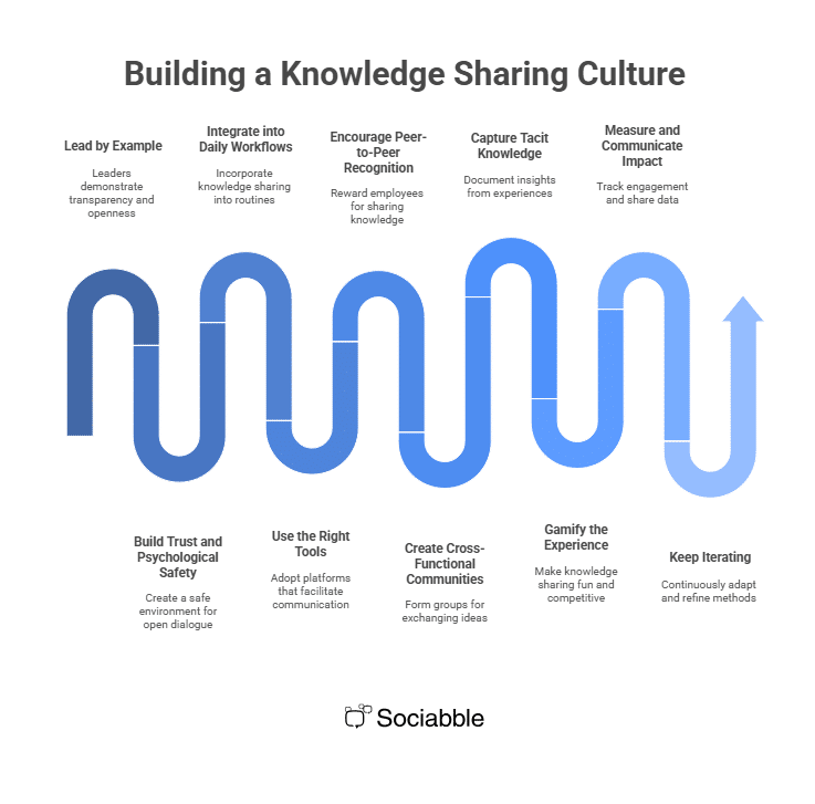 Every company is sitting on a goldmine of expertise. Yet, too often, that knowledge disappears when people move teams, change roles, or leave the organization. The problem isn’t a lack of information; it’s that valuable knowledge, and even critical knowledge, remains trapped in individual minds instead of being shared across the business. Without a company culture of knowledge sharing, teams end up reinventing the wheel, repeating avoidable mistakes, and slowing innovation. The result? Lost time, lost opportunities, and lost potential. In this guide, we’ll define what a knowledge sharing culture really means, explain why it’s essential to organizational success, and outline ten practical steps to help your company make it part of everyday work. What Is a Knowledge Sharing Culture? A knowledge sharing culture is one where employees naturally exchange insights, ideas, and experiences across departments, levels, and geographies. It’s more than uploading files to a shared drive. It’s about creating a social, continuous flow of information that helps people work smarter together. When sharing becomes part of your larger company culture, knowledge stops being static. It becomes dynamic: shaped by real-time feedback, team collaboration, and improvement. From onboarding checklists to lessons learned after client projects, shared expertise prevents valuable insights from becoming isolated or lost. This learning culture of institutional knowledge exchange creates collective intelligence. Instead of relying on a few experts, every employee becomes a contributor to organizational success. Whereas knowledge hoarding stores away the collective experiences and insights of the organization, knowledge sharing creates channels and means to easily access and use the information. Knowledge Sharing vs. Knowledge Management Knowledge management and knowledge sharing often get used interchangeably, but they’re not the same thing. Knowledge management focuses on systems, repositories, and structures; it’s about organizing and storing information efficiently. Knowledge sharing, on the other hand, is about people. It’s driven by curiosity, motivation, and trust. It happens when employees feel encouraged to share what they know and confident that their contributions matter. The two work best together: knowledge management tools provide the structure, and knowledge sharing strategies bring that structure to life. Without people actively contributing to institutional knowledge exchange, even the most sophisticated knowledge management system remains an empty shell. Why Create a Knowledge Sharing Culture? Organizations that share knowledge learn faster, innovate more effectively, and keep their employees engaged. When information flows freely, teams can collaborate without friction and new hires can get up to speed more quickly. According to research by the Harvard Business Review, companies with strong knowledge flows are significantly more productive and have higher employee satisfaction rates. It’s a powerful reminder that when knowledge circulates, morale and performance follow. A strong knowledge sharing culture also fuels agility. In fast-changing markets, organizations that can rapidly examine knowledge transfer to generate insights, and then adapt accordingly, are the ones that keep a competitive advantage. Benefits of a Knowledge Sharing Culture When knowledge is shared openly, everyone benefits, from the newest recruit to senior leadership. The outcomes are tangible and far-reaching when it comes to a true culture of knowledge sharing within a business: Accelerated organizational learning and onboarding: New employees integrate faster when best practices are readily accessible, leading to better retention, loyalty, and job security. Fewer mistakes and redundancies: Teams avoid repeating errors because lessons learned are captured and circulated. Increased innovation and problem-solving: Shared ideas spark creative solutions and facilitate collaboration companywide. Higher engagement and collaboration: Employees feel more connected to their peers and to the company’s mission. Stronger company culture and retention: A transparent, inclusive environment builds loyalty and purpose. Many organizations discover that knowledge sharing becomes a cornerstone of employee engagement, reinforcing a sense of belonging and contribution. Common Barriers to Knowledge Sharing If knowledge sharing is so beneficial, why isn’t it the norm? The answer lies in the barriers that quietly discourage it, and hinder knowledge sharing as an everyday practice. Fear, friction, and communication silos are often the main culprits. Employees may hesitate to share if they don’t feel safe or valued, or if the knowledge sharing processes feel complicated and unrewarding. A lack of trust, unclear incentives, information overload, and poor technology all play a role. Psychological safety is key. When people believe their ideas will be respected, they’re far more likely to contribute. Leadership behavior also sets the tone; when leaders communicate transparently and admit what they don’t know, they model the behaviors that make knowledge sharing safe and natural. Sharing knowledge becomes second-nature. To overcome these barriers and avoid a dangerous knowledge gap, organizations must treat knowledge sharing activities as a critical component of how work gets done. How to Create a Knowledge Sharing Culture: 10 Practical Steps Building an organizational knowledge sharing culture doesn’t happen overnight. It’s built through consistent habits, a clear and relevant knowledge sharing system, and trust. Here’s how to make it happen. 1. Lead by Example Leaders set the standard for how information flows. When executives share updates, feedback, and lessons learned, it signals that transparency is valued. Regular all-hands briefings or open Q&A knowledge sharing sessions encourage knowledge sharing among employees a