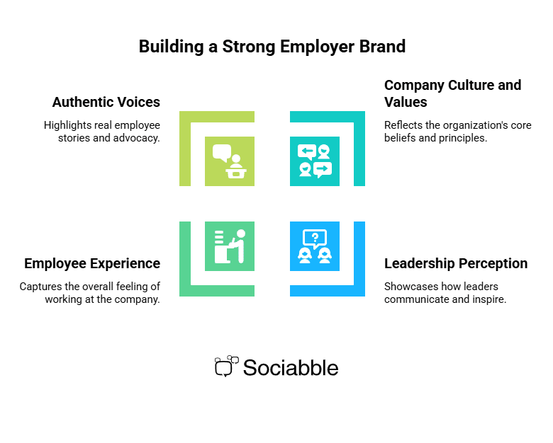 Many companies still treat employer branding and recruitment marketing as interchangeable terms. In reality, they’re two sides of the same coin: each critical to attracting and retaining top talent, yet driven by distinct goals and timeframes. Confusing one for the other can lead to missed opportunities, inconsistent messaging, and wasted budget. In this post, we’ll clarify what employer branding and recruitment marketing really mean, how they differ, and why the most effective talent strategies use both in tandem. You’ll also discover how to measure their impact, and how the right technology can bring them together into one seamless narrative. What Is Employer Branding? Employer branding is how a company shapes and maintains its reputation as a great place to work. It’s the ongoing story you tell, through your people, culture, and values, about what makes your organization unique and why employees are proud to be part of it. The goal of your employer branding is simple: to build long-term trust and reputation among current employees and future employees through a strong employer value proposition. It’s less about filling roles quickly, and more about nurturing a workplace that attracts talent organically over time. Companies with a compelling employer brand tend to enjoy higher retention, better employee engagement, and lower recruitment marketing costs, because people want to be associated with them. A powerful employer brand is a positive employer brand; one that current employees and outsiders know and feel good about. Strong employer branding shines through in several ways: Company culture and values: What your organization stands for and how it lives those principles. This includes both an employer and an employee value proposition. Leadership perception: How leaders communicate purpose, transparency, and empathy. Employee experience: What it feels like to work there, from onboarding to growth. Authentic voices: Real stories, employee testimonials, and advocacy from employees themselves. Unlike recruitment marketing, employer branding isn’t a campaign; it’s a continuous effort built on consistency. Every internal newsletter, every manager message, every piece of social content contributes to it. And it thrives on storytelling and emotion. A good employer brand doesn’t just tell people what you do; it makes them feel why it matters. Typically, HR and marketing teams, together with employer branding teams, own this narrative, working closely with communications to keep it alive. Think of a company sharing behind-the-scenes moments, celebrating employee achievements, or showcasing CSR initiatives on social media. These human stories reinforce culture and credibility in ways no job opening ad can. Employer branding efforts include these kinds of elements. Pro Tip: With Sociabble’s employee advocacy features, companies can amplify these authentic employer branding stories effortlessly. By empowering employees to share content across their networks, Sociabble helps transform everyday experiences into visible proof of company culture, strengthening employer branding visibility across digital channels. What Is Recruitment Marketing? If employer branding strategy builds a company’s reputation, recruitment marketing drives action. It’s the set of strategies and campaigns designed to promote open roles, attract high quality candidates, and motivate them to apply. The goal of recruitment marketing strategies is clear: generate awareness and attract active job seekers. It’s more campaign-based, built around job ads and social media campaigns, with short-term deliverables focused on specific hiring process needs. Where employer branding inspires, recruitment marketing brings conversion, attracting the right talent from among potential employees and welcoming them into the recruitment funnel. Common recruitment marketing focus areas include: Targeted job openings ads on platforms like LinkedIn or Indeed. Optimized career sites that highlight roles and streamline applications. Paid campaigns designed to attract specific skill sets. Conversion tactics such as retargeting or optimized landing pages. The tone here is persuasive and action-oriented, often handled by Talent Acquisition or Recruitment teams. Campaigns are typically measured in weeks or months, and they rely on precise data to improve performance in a competitive job market. For example, a recruitment marketing team might run a paid campaign to attract developers in a specific region, analyze which ad creative performs best, and adjust accordingly to improve cost per applicant. And while recruitment marketing is often the first visible touchpoint to engage potential candidates, consistency across channels is crucial, from social media job postings to email campaigns and career sites. That’s where tools like Sociabble’s employee communication platform can help. By centralizing job opening announcements, videos across digital job boards, and campaign content, companies ensure that everyone, from recruiters to hiring managers, shares a consistent message across every touchpoint. Key Differences Between Employer Branding and Recruitment Marketing At a glance, employer branding and recruitment marketing seem closely related, and they do indeed share similarities. But their distinctions are significant. Employer branding builds the foundation through employer brand content; recruitment marketing activates it and spreads it to the right people. Think of it this way: Aspect Employer Branding Recruitment Marketing Goal Build long-term reputation and trust Drive applications for open roles Focus Culture, values, employee experience Promote job openings, campaigns, conversion Tone Emotional, narrative-driven Persuasive, action-oriented Timeframe Continuous Campaign-based Ownership HR / Employer Brand teams Talent Acquisition / Marketing teams Employer branding shows what it’s like to work at your company. Recruitment m