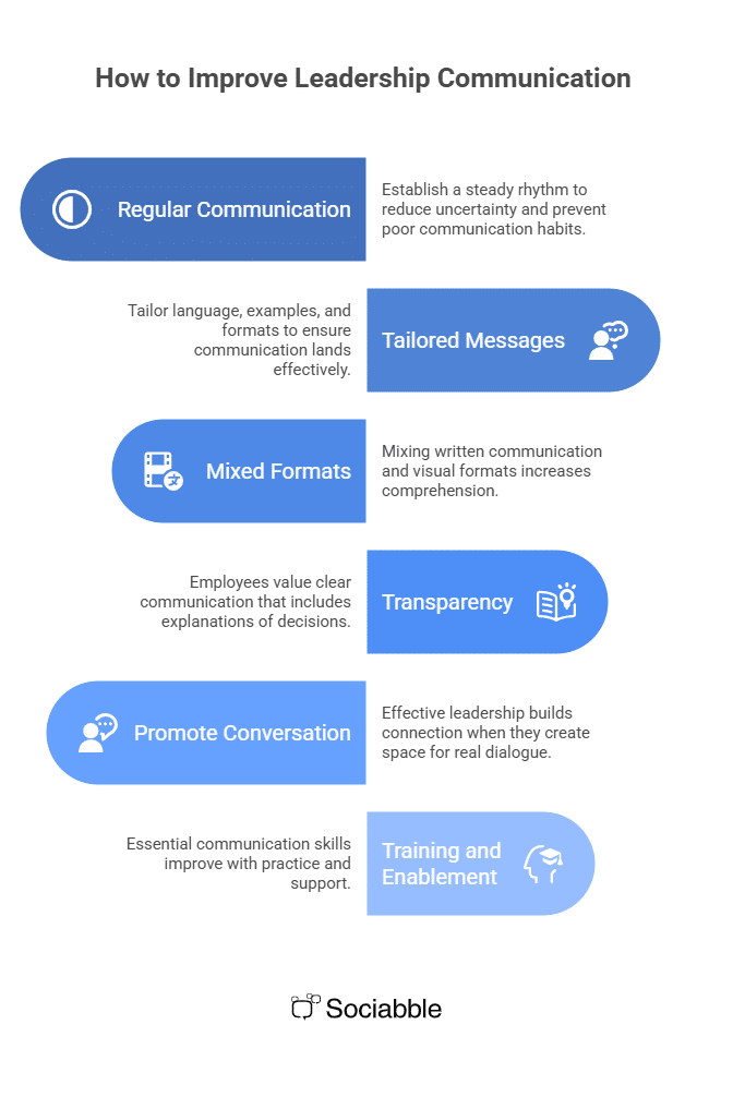 Leadership communication shapes how employees understand strategy, experience culture, and build trust in the organization. People do not assess effective leaders only by the decisions they make. They also pay attention to how those decisions are communicated, how consistently leaders show up, and how clearly they explain what matters. Strong leadership communication creates alignment, reduces anxiety, enhances professional development, and supports both performance and engagement. This guide explores what leadership communication is, why leadership communication skills matter, and the specific habits in a professional setting that help leaders connect with employees across teams, locations, and contexts. And the end result? Stronger relationships, better productivity, and a meaningful emotional connection. What Is Leadership Communication? Leadership communication is how leaders inform, guide, and motivate people through clear, consistent, and human messaging. It turns abstract strategy into accessible meaning and helps employees understand where the company is heading and how they fit into the plan. For those in a leadership position, being able to forge this kind of strong connection with their workforce is key. And it occurs in everyday moments. Strategy rollouts become easier when effective leaders present them in clear language. Team updates gain traction when they reinforce shared priorities. Even difficult decisions become more manageable when leaders communicate with clarity and respect. These moments, expressed through spoken words, written statements, and even body language, influence how employees feel about their work and their connection to the organization. Why Leadership Communication Matters Leadership communication skills directly influence trust, engagement, performance, and organizational culture. When messaging is clear and predictable, employees understand expectations and can prioritize their work without second guessing. This alignment strengthens productivity and reduces friction between team members. Employees also expect visible leadership in hybrid and distributed environments. Distance increases the risk of misunderstanding, which is why consistent leadership visibility plays such a critical role. Research on employee engagement consistently shows that communication quality is one of the strongest predictors of how connected people feel at work. During transformation or crisis, communication becomes even more important. Poor leadership communication can make a bad situation even worse. Employees look for guidance and reassurance, and leaders who communicate effectively and openly help stabilize their teams. This echoes broader principles of internal communication that anchor employees during moments of change. Practical Examples of Leadership Communication in Action Leadership communication is most effective when it is clear, honest, and responsive to real conditions inside the company. For example, leaders who communicate transparently during restructuring or major organizational changes maintain stronger credibility. Transparency about the situation and its rationale helps employees understand the context instead of speculating. Acknowledging challenges in difficult periods also builds trust. Employees respond positively when leaders recognize reality and show empathy. This approach aligns with practices often used in change management, where clarity and honest framing help employees navigate uncertainty. Strategic communication is another key moment. When effective leaders explain priorities and the reasoning behind them, team members can make informed decisions faster and avoid conflicting interpretations. For example, for global organizations, Sociabble Enterprise Video can support strong communication skills through leadership visibility. It helps leaders deliver updates in a human, conversational format while collecting real time reactions and body language that give insight into employee sentiment. Key Components of Strong Leadership Communication Effective leadership communication combines message clarity, emotional intelligence, and consistent delivery across channels. When these elements work together, employees feel informed, supported, and aligned. A Clear and Memorable Narrative Successful leaders need to articulate direction in a way employees can recall and repeat, without relying on confusing, corporate speak. A compelling narrative backed by good communication helps employees understand how their work contributes to broader organizational goals and why initiatives matter. Clear storytelling also reduces misunderstandings that often arise in complex environments. It communicates the most important points without distractions. Consistency Across Messages and Channels Consistency builds credibility. When strong leaders deliver the same message through email, the intranet, live sessions, and manager cascades, employees trust that the direction is stable. Discrepancies between channels can lead to confusion, especially in global organizations that rely heavily on multi-channel communication to reach distributed teams. An Empathetic Tone Adapted to Context It’s important to demonstrate empathy. Why? Because empathy helps leaders connect with people in different situations. Frontline team members may need actionable detail, hybrid teams may need clarity on expectations, and stressed teams may need reassurance. An empathetic leader who adjusts tone and adapts to different communication styles optimize their message for real employee contexts, which strengthens both trust and morale. Mechanisms for Two Way Dialogue Communicators should create space for employee voice. Leaders who invite questions, encourage comments, and close constructive feedback loops foster connection and credibility. Surveys, quizzes, and AMAs help leadership understand what employees need, and facilitates their responding appropriately. Effective communication via dialogue al