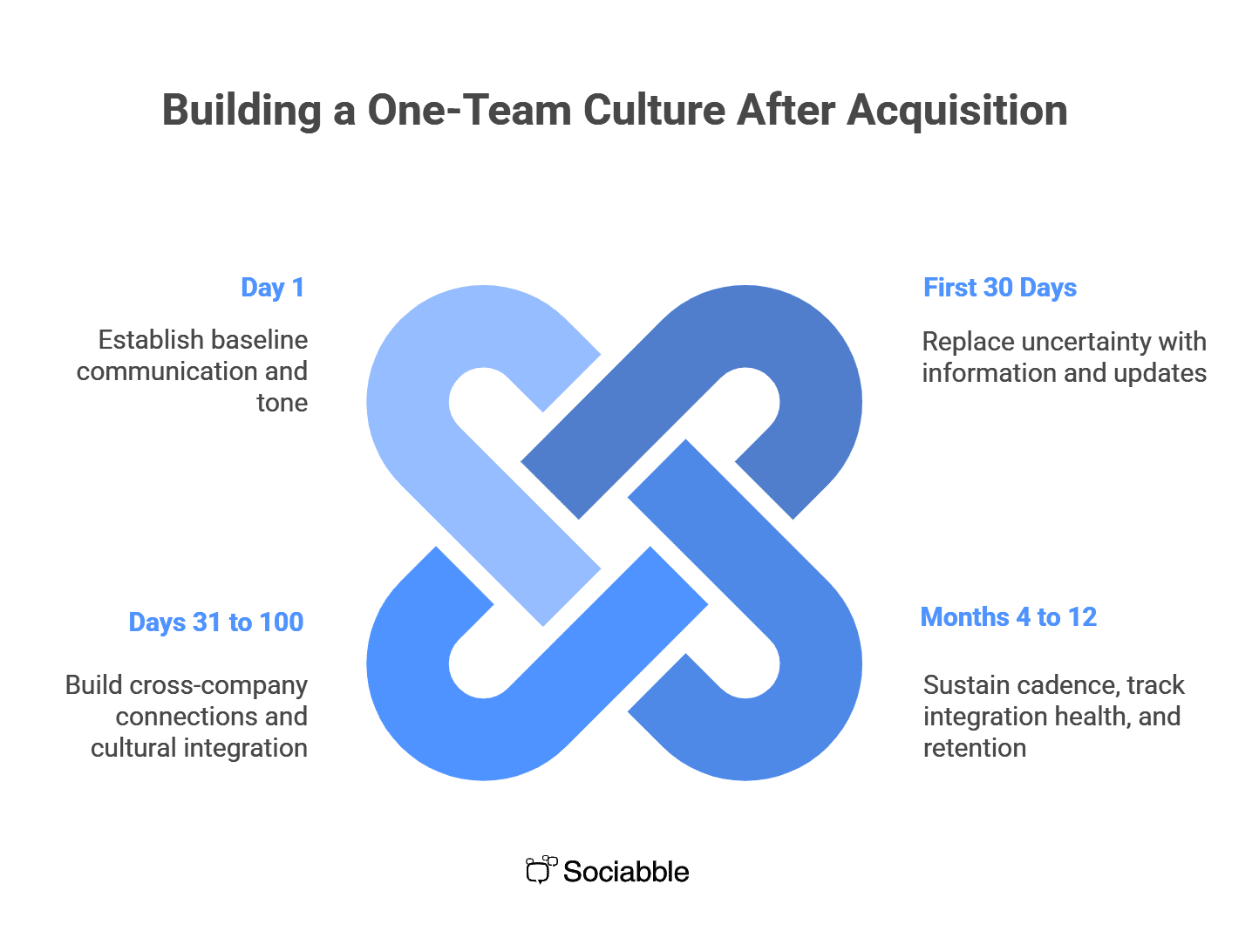 Quick Takeaways: Post-acquisition internal communications is the primary lever for cultural integration, not a support function. Without a structured comms plan from the integration management office, the one-team moment never arrives. The biggest communication failure in M&A is not what you say on Day 1. It is the silence that follows. Communication intensity must increase after the deal closes, not taper off. Frontline and deskless employees are the hardest to reach and the fastest to disengage. Any acquisition communication plan that does not account for non-connected workers leaves a critical workforce segment behind. One-team culture does not emerge from a single announcement. It is built through deliberate, phased communication across four time horizons: Day 1, the first 30 days, the first 100 days, and the full first year. If you cannot track who received the message and who did not, you cannot claim the integration is working. Your internal communications team needs to follow up even after a “successful integration” to keep tabs on employee concerns and key integration milestones. Acquisitions are won or lost in the months after the deal closes. The legal and financial work gets done: it has lawyers, deadlines, and board pressure behind it. The communication work does not always get the same urgency, and that gap is where integration unravels. The result? Poor communication, corporate cultural differences, and company leadership that fails to communicate key messages. No matter what, every employee in an acquired company is asking the same question before they read a single official message: What does this mean for me? How you answer that question, and how consistently you answer it across every location and workforce segment, determines whether you build a unified organization or manage a fragile coalition. This guide gives internal communications leaders a step-by-step framework for post-acquisition communications, from Day 1 messaging through the 12-month integration cadence. Why Post-Acquisition Internal Communications Determine Integration Success Post-acquisition integration fails most often not because of financial miscalculation, but because of people. And people problems start with communication gaps. McKinsey research consistently finds that roughly 70% of mergers fail to achieve their expected synergies. The root cause is rarely the deal structure. It is execution: slow decisions, unclear direction, and employees who disengage before the integration plan has a chance to land. What drives communication failure in M&A: The vacuum problem: when leadership goes quiet after Day 1, informal communication fills the space. Rumors travel faster than official channels can correct them. The employee decision window: the choices that damage integration most, including quiet disengagement, key talent exits, and resistance to change, are made in the first 90 days, long before any formal retention program activates. The IC underinvestment pattern: change communication is often the last workstream funded and the first cut when integration timelines compress. Internal communications is not a support function in M&A. It is the mechanism by which two organizations either become one or remain two. What Every Employee Needs to Know on Day 1 Before any vision statement goes out, or larger communication strategies are discussed, every employee in the acquired organization is already running the same mental calculation: am I keeping my job, my manager, my team? Generic leadership messages that lead with strategic rationale and skip personal clarity do not reassure employees. They confirm that leadership is focused on the deal, not the people inside it. Three things every employee needs answered on Day 1: Job security: be direct about what is confirmed, what is under review, and when decisions will be communicated. Honesty about uncertainty builds more trust than false reassurance. Leadership continuity: who is their manager, who leads their function, and who is accountable for their location going forward. Day-to-day change: what changes immediately, what stays the same for now, and where employees go with questions. What to prepare before the Day 1 message goes out: All-company message from the CEO or combined leadership team Manager talking points, distributed before the all-company message, so supervisors can hold team conversations that same day A written FAQ for frontline supervisors covering the questions employees will actually ask A structured internal communication plan confirming every channel is activated and no employee segment is unreachable Aspirational framing has its place. Day 1 is not that place. Also read Internal Communication Plan Template: All the Steps and Tools You Need Don’t be intimidated. Putting together your internal communication plan template is easier than you think, if you follow these simple… How to Build a Post-Acquisition Communication Plan: Step-by-Step One-team culture does not emerge from a single announcement. It is built across four deliberate steps, each with distinct communication strategies and objectives attached. 1. Day 1: Establish the communications team baseline The Day 1 message is the first proof point of how the new organization communicates. It sets the tone for everything that follows. What to get right on Day 1: Activate every channel simultaneously so no employee segment receives the news late or from an unofficial source Match the tone to the deal type: a genuine merger of equals requires different framing than an acquisition where one brand will absorb the other Equip supervisors before employees: the most trusted information source for most employees is their direct manager, not the CEO 2. First 30 days: Replace uncertainty with information The first month is defined by anxiety, not excitement. Employees are waiting for decisions that affect them personally, and every day without an update is a day the rumor mill fills the gap