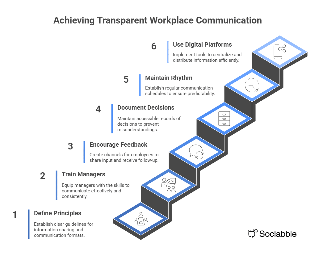 Miscommunication rarely announces itself. It shows up as a project that drifts without explanation, a team that scrambles because priorities shifted overnight, or an employee who hears important news secondhand. Moments like these create friction that could have been avoided with clearer, more proactive communication. Transparent communication offers a practical path forward. In this guide, we will define what transparent communication means at work, explain why it matters, show examples from real organizational life along with actual benefits, and outline best practices you can start using right away. What Is Transparent Communication at Work Transparent communication means sharing accurate and relevant information in a timely way so employees have the context they need to understand decisions, expectations, and organizational direction. It signals a willingness to provide clarity rather than leaving teams to interpret partial information. At its core, it is a promise: people should not have to guess what matters or why decisions happen. Transparent communication is not the same as oversharing. You do not need to disclose confidential data, sensitive information from HR, or half-baked ideas that may cause confusion. Transparent communication focuses on what employees need to do their best work, and it avoids burdening them with details that create noise rather than clarity. How Transparency Operates Across the Organization Every level of the company contributes to a culture of transparency. When transparent internal communication flows through top-down, bottom-up, and cross-functional channels, it becomes embedded in daily work rather than an occasional messaging effort. Top-down clarity from leaders sets direction. This includes explaining decisions, sharing strategic updates, and providing the context that shapes organizational priorities. When you communicate openly, in plain language and with predictable cadence, team members feel grounded instead of reactive. Bottom-up feedback strengthens this dynamic. Employees should have channels to ask questions, surface risks, and voice concerns without fear of repercussions. These safe spaces in the actual workplace create psychological safety, which research has shown to result in trust building, and to be essential for strong performance and employee engagement. In fact, psychological safety is a leading factor in both employee engagement and employee satisfaction. Happier employees are simply more involved. Cross-functional transparent communication reduces silos by helping team members understand the full picture of how their work connects. When departments share dependencies, risks, and timelines openly, collaboration becomes easier and delays are minimized. Why Transparent Communication Matters Transparent communication shapes everything from trust to operational efficiency. When team members understand what is happening and why, they can act decisively. When information is unclear or fragmented, work slows down and frustration builds over the failure to communicate. Here are some of the most important benefits. Builds Trust and Reduces Uncertainty Transparent communication signals respect and builds trust. Employees trust leaders who communicate openly and honestly, even when the news is complex or tough to hear. Clear information reduces unnecessary speculation, which often fills the gaps when communication is vague or delayed, and keeps everyone on the same page. Strengthens Alignment and Productivity Team members work faster when they operate with the same information. Transparent communication practices enable stronger decision making, helps teams clarify priorities, and reduces rework caused by misunderstood objectives. When everyone has access to the same sources of truth, workplace goals feel coherent rather than disjointed. Boosts Employee Engagement Employees feel valued when they are informed. Predictable and open communication rhythms show that leadership considers employees partners rather than passive recipients of information. This sense of involvement contributes to higher engagement and stronger morale. Internal research across industries consistently shows that high quality, open communication is one of the strongest predictors of engagement. Improves Change Management Outcomes Most resistance to change comes from uncertainty in the workplace. When employees understand the reasons behind new processes, tools, or structures, anxiety decreases. Transparent communication through open dialogue transforms change from something imposed to something explained, which makes adoption smoother. Examples of Transparent Communication in the Workplace To understand what transparency looks like in practice, it helps to look at specific behaviors and mechanisms inside a company. These examples show how transparency comes to life across different moments in the employee experience, from team meetings to town halls. Transparent Leadership Updates Leaders should communicate strategy updates, clarify business priorities, and explain the reasoning behind workplace decision making. These updates might take the form of video messages, leadership posts, town hall summaries, or written FAQs. What matters most is consistency and clarity. Clear Project and Team Communication Teams use visible decision logs, progress trackers, and shared channels to keep everyone informed. When stakeholders can see what changed, who made the decision, and why it happened, collaboration feels predictable rather than chaotic. Also read:Energizing Internal Communication and Engaging Employees – The AXA Group Case Equal Access to Information A transparent workplace ensures that information is not limited to those with the loudest voices or closest proximity to leadership. Organizations often create centralized dashboards, maintain updated policies, and offer searchable digital resources that employees can rely on. For example, many team members use internal commun