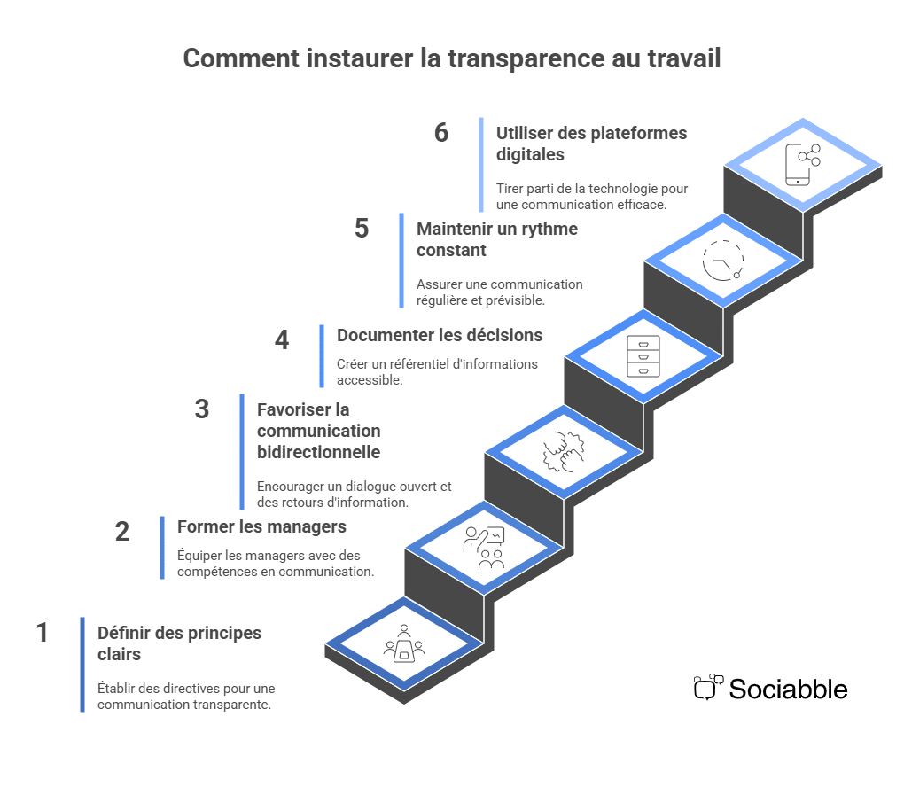 Les problèmes de communication ne se manifestent pas toujours bruyamment. Ils se traduisent par un projet qui dévie sans explication, une équipe désorientée après des changements soudains de priorités, ou un employé qui apprend une nouvelle importante par un collègue plutôt que par sa hiérarchie. Ces situations génèrent de la frustration et des erreurs évitables. Autant de frictions que seule une communication plus claire et proactive aurait pu prévenir. La communication transparente offre une réponse concrète à ces défis. Dans ce guide, nous définirons ce qu’elle signifie réellement, pourquoi elle est importante en entreprise, quels bénéfices concrets elle apporte et comment la mettre en place au quotidien grâce à des pratiques efficaces. Qu’est-ce que la communication transparente en entreprise La communication transparente consiste à partager des informations exactes et pertinentes en temps voulu, afin que les collaborateurs disposent du contexte nécessaire pour comprendre les décisions, les attentes et la direction d’une organisation. Elle doit s’adapter à la manière dont chaque fonction et domaine de l’entreprise opère, afin de garantir une diffusion efficace et pertinente de l’information. C’est une démarche d’ouverture qui vise à donner de la clarté plutôt que de laisser les équipes deviner les intentions derrière des messages incomplets. En résumé, c’est une promesse : personne ne devrait avoir à deviner ce qui compte vraiment, ni pourquoi une décision est prise. Une question importante que l’on pose souvent est : faut-il tout dire pour être transparent? La réponse est non. Être transparent ne signifie pas tout dire. Il ne s’agit pas de divulguer des données confidentielles, des informations RH sensibles ou des idées encore inabouties. La transparence consiste à partager ce qui aide les employés à mieux travailler, sans les submerger de détails inutiles qui génèrent de la confusion au lieu de la clarté. Elle favorise la compréhension d’un contexte, comme par exemple, la mise en place de certaines solutions, la requête de certaines tâches, ou encore la prise de décision de la part de la direction. Il est également important que la communication soit alignée avec les valeurs de l’entreprise, afin de renforcer la cohésion interne et la confiance des équipes. Ainsi, la transparence renforcera la crédibilité auprès des salariés et des clients, en instaurant un climat de confiance et d’authenticité à tous les niveaux de l’entreprise. Comment la transparence fonctionne à tous les niveaux de l’entreprise Chaque échelon de l’organisation contribue à la culture de la transparence. Lorsqu’une communication ouverte circule du haut vers le bas, du bas vers le haut et entre les services, elle devient un réflexe collectif, intégré dans le quotidien du travail plutôt qu’un simple exercice ponctuel. Cette transparence favorise un climat de confiance et de proximité, permettant de bâtir des relations solides entre les collaborateurs et de renforcer l’engagement au sein de l’entreprise. Une communication descendante claire Les dirigeants fixent la direction en expliquant les décisions, en partageant les mises à jour stratégiques et en clarifiant la priorité des orientations à adopter. Une communication régulière, simple et compréhensible renforce la stabilité et évite une réactivité permanente. Un feedback ascendant structuré Les collaborateurs doivent disposer de canaux sûrs de feedback pour poser des questions, signaler des risques et exprimer leurs préoccupations sans crainte de répercussions. Ces espaces de confiance nourrissent la sécurité psychologique, un élément structurant qui nourrit à la fois la performance et l’engagement. En effet, quand les employés se sentent écoutés, ils s’impliquent davantage. Une transparence transversale entre équipes Partager ouvertement les dépendances, risques et calendriers permet à chacun de comprendre la vision d’ensemble. Cette communication entre fonctions, équipes et départements a un impact concret : elle réduit les silos, favorise la collaboration et minimise les retards. A noter : la façon dont l’information est partagée peut influencer la mise en place d’environnements de travail plus collaboratifs et innovants. Comment la communication transparente impacte les activités en entreprise La communication transparente influence tout : la confiance, la productivité et la cohésion d’équipe. Lorsqu’un collaborateur comprend ce qui se passe et pourquoi, il agit avec assurance. À l’inverse, quand l’information est floue ou fragmentée, le travail ralentit et la frustration s’installe. 1. Renforce la confiance et réduit l’incertitude La transparence est un signe de respect. Les employés font davantage confiance aux leaders qui communiquent avec honnêteté, même lorsque les nouvelles sont difficiles. Une information claire réduit les rumeurs et les suppositions, maintenant tout le monde aligné sur la même réalité. 2. Favorise l’alignement et la productivité Quand tout le monde dispose des mêmes informations, les décisions sont plus rapides et plus justes. Une communication transparente clarifie les priorités, diminue les malentendus et évite les pertes de temps liées à la réinterprétation des objectifs. Ainsi, la communication transparente représente une solution efficace pour clarifier les priorités et améliorer la productivité au sein de l’entreprise. 3. Stimule l’engagement des employés Les collaborateurs se sentent valorisés lorsqu’ils sont informés. Des échanges réguliers et ouverts montrent que la direction les considère comme des partenaires et non comme de simples destinataires de messages. Cet alignement renforce l’engagement des salariés, car la transparence favorise leur engagement et leur motivation, deux piliers d’une culture d’entr