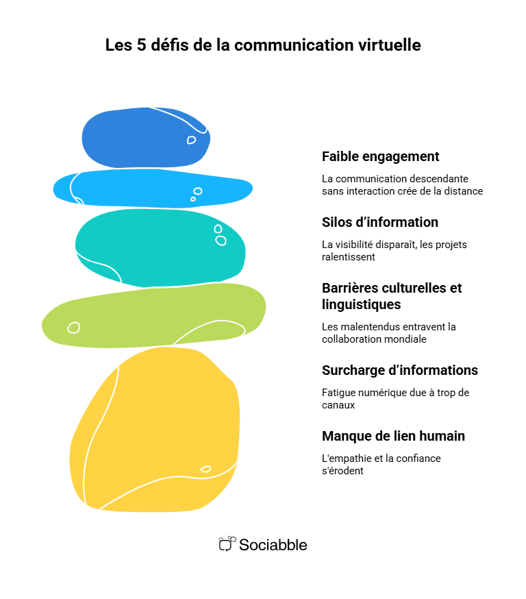 Aujourd’hui, une grande partie de nos échanges se fait à distance, à travers des écrans et des outils digitaux. Que ce soit dans nos vies personnelles, mais aussi professionnelles. Certes, internet facilite notre façon de collaborer, mais de nouveaux défis apparaissent. La communication virtuelle représente ainsi l’ouverture sur un nouveau monde social et professionnel, où la frontière entre réel et virtuel s’estompe progressivement. Par ailleurs, d’autres éléments (par exemple, les indices non verbaux, visuels ou paraverbaux) enrichissent désormais la transmission des messages. Dans cet article, nous passons en revue les principaux obstacles de la communication virtuelle et partageons les bonnes pratiques pour la rendre plus fluide, humaine et efficace. Quand le travail hybride redéfinit la communication Tout le monde l’a désormais constaté : l’essor du télétravail et des modèles hybrides a profondément transformé nos interactions. Réunions, séances de brainstorming ou discussions informelles : tout se passe désormais en ligne. Cette évolution met en lumière la différence entre la réalité physique des échanges en face-à-face et la communication à travers un écran, qui agit à la fois comme interface et barrière. En effet, l’absence de contact direct limite la spontanéité et la richesse des interactions humaines. D’un point de vue plus général, cette transformation digitale a ouvert la voie à une collaboration mondiale, mais a aussi fait émerger de nouvelles difficultés : maintien de la cohésion, de la confiance et de l’engagement à distance. L’absence de présence physique dans la communication virtuelle accentue ces défis et modifie la perception de la réalité des échanges. Communiquer efficacement dans ce contexte ne consiste plus seulement à échanger des informations, mais à créer du lien, de la clarté et une culture commune à travers des canaux virtuels. Voyons ce que recouvre la communication virtuelle, ses principaux défis, et comment la maîtriser au quotidien. Qu’est-ce que la communication virtuelle ? La communication virtuelle désigne tous les échanges d’informations réalisés à l’aide d’outils digitaux : visioconférences, chats, e-mails ou intranets collaboratifs. Elle permet à des équipes réparties dans le monde entier de travailler ensemble, malgré les fuseaux horaires et les distances. Dans un environnement hybride, elle garantit connexion, collaboration et cohérence, en diffusant la culture d’entreprise et la transparence auprès de tous, où qu’ils se trouvent. Les 5 grands défis de la communication virtuelle Même avec les meilleures intentions, la communication à distance peut vite perdre en efficacité sans une structure claire et des outils adaptés. Par exemple, la gestion des communications et des projets à distance représente un défi clé pour les équipes virtuelles. Voici les cinq défis les plus fréquents, et comment y répondre. 1. Manque de lien humain Sans interactions en face à face et en l’absence de contact physique, l’empathie et la confiance s’érodent. Les messages paraissent plus froids, les malentendus augmentent et la cohésion d’équipe s’en ressent. À long terme, cela nuit à la motivation et à la qualité de la collaboration. La communication virtuelle pourrait avoir un impact direct sur certains employés, qui peuvent se sentir isolés ou moins engagés dans les échanges. Dans ce contexte, les liens sociaux se redéfinissent, passant de relations directes à des connexions virtuelles qui peuvent modifier la dynamique d’un groupe. 2. Surcharge d’informations Trop de canaux, de notifications et de messages instantanés entraînent une fatigue numérique. De plus, entre réseaux sociaux et messagerie instantanée, l’importance d’une réponse rapide devient cruciale pour maintenir la fluidité des échanges. Résultat: les collaborateurs passent plus de temps à jongler entre plateformes (et parfois entre dispositifs) qu’à se concentrer sur leur travail. La gestion des réponses et des sollicitations numériques devient alors un enjeu majeur pour préserver la concentration et le bien-être des employés. 3. Barrières culturelles et linguistiques La collaboration mondiale est une richesse, mais aussi une source de malentendus. Ce qui semble direct pour une culture peut paraître brusque pour une autre. Souvent sous-estimé, le fait de développer une véritable maîtrise des codes culturels et linguistiques est essentiel, afin de faciliter la communication interculturelle et digitale. En effet, l’interprétation des propos peut varier considérablement selon les cultures, ce qui rend nécessaire une attention particulière à la dimension humaine du dialogue. 4. Silos d’information Quand les documents et mises à jour sont éparpillés entre plusieurs outils, la visibilité disparaît. Les projets ralentissent, les connaissances se dupliquent et le sentiment de déconnexion s’installe. La centralisation de l’information devient alors essentielle pour garantir un accès rapide et fiable à toutes les données nécessaires. Une bonne gestion de l’archivage et de la traçabilité des communications permet également de retrouver facilement chaque échange ou document enregistré. Ainsi, les projets gagnent en efficacité. 5. Faible engagement et manque de feedback Une communication trop descendante crée de la distance. Les collaborateurs reçoivent de l’information du top management mais n’ont pas toujours la possibilité de réagir, de contribuer ou de se sentir écoutés. La solution : favoriser l’échange lors des réunions ou interactions virtuelles, pour renforcer l’engagement de chacun et encourager la participation active. De plus, recueillir le retour d’expérience et le feedback des équipes permet d’identifier des axes d’amélioration continue dans les pratiques de communication virtuelle. 7 