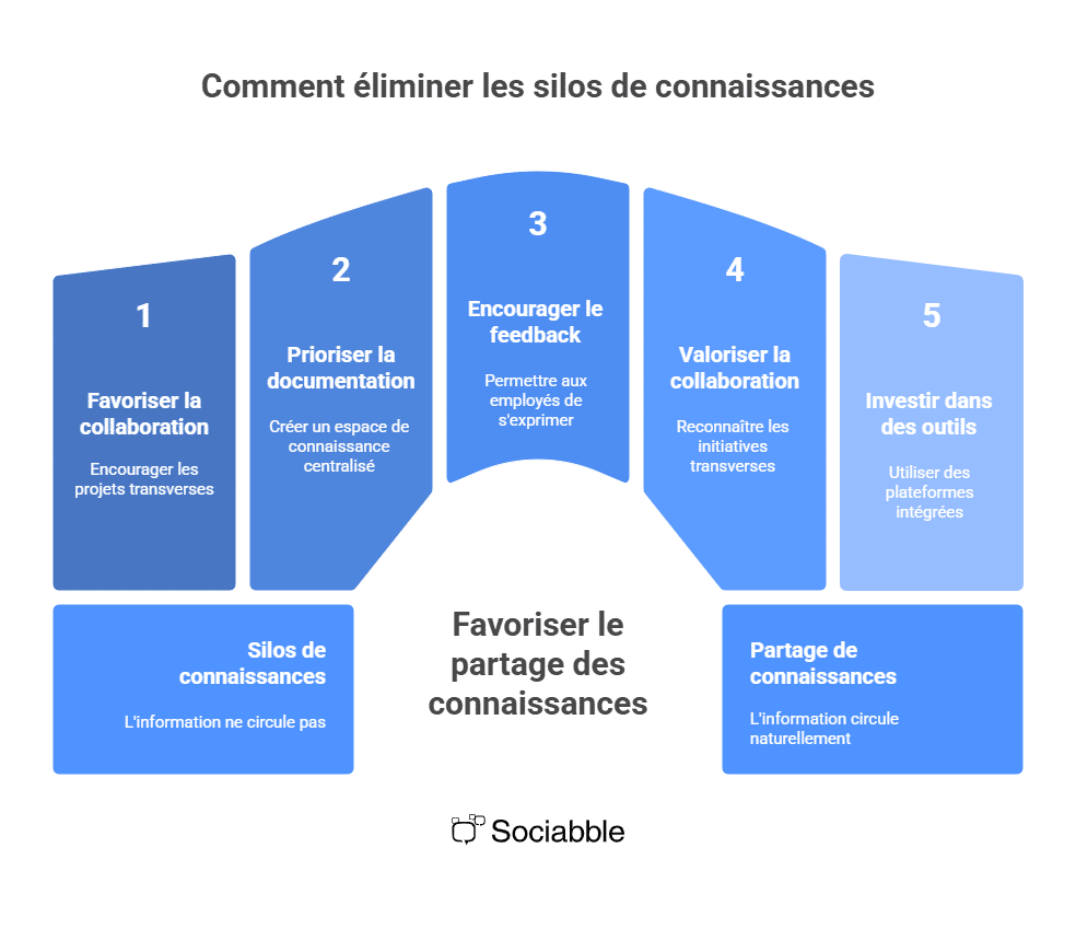 Le plus grand obstacle au partage des connaissances ? Les silos de connaissances. Ils existent bel et bien, et dans cet article, vous allez apprendre à les reconnaître. Et surtout, à les empêcher de se former. Vous est-il déjà arrivé de découvrir que deux équipes avaient résolu le même problème chacune de leur côté ? C’est une situation frustrante pour tout leader, car elle ne révèle pas un manque de compétence, mais un manque de connexion. Quand l’information reste enfermée dans un service, un outil ou un canal, même les meilleurs collaborateurs peinent à collaborer et à innover. Les silos de connaissances sapent discrètement la productivité, compliquent la prise de décision et détériorent la circulation de l’information. Ils rendent également plus difficile pour les employés de se sentir alignés, informés et valorisés. Ils sont donc un frein majeur à une gestion efficace des données. Et par conséquent, à la performance globale de l’entreprise. Dans ce guide, nous expliquons ce que sont les silos de connaissances, pourquoi ils apparaissent, et comment les éliminer. Nous verrons également comment une plateforme comme Sociabble aide les organisations à centraliser l’information et à construire un environnement de travail plus connecté, où les données et les informations circulent librement. Qu’est-ce qu’un silo de connaissance ? Un silo de connaissance apparaît lorsque des informations restent enfermées dans une équipe, un outil ou un espace précis, sans être accessibles à ceux qui en ont besoin. Ces silos de données peuvent créer des barrières internes qui empêchent le partage d’idées, la réutilisation de ressources et l’apprentissage collectif. Ils ne sont pas toujours intentionnels : souvent, ils se forment progressivement, au fil de la croissance d’une organisation, de l’introduction de nouveaux outils ou de l’adaptation à des modèles de travail hybrides. Mais à la base, un silo de connaissance n’est pas un problème technique : c’est un problème de communication. Quand l’information ne circule pas librement au sein d’une entreprise, dès l’onboarding ou dans les échanges quotidiens, toutes les décisions se prennent sans contexte complet, et les dirigeants perdent de la visibilité. Les silos deviennent alors inévitables. Pourquoi les silos de connaissance existent Les silos naissent souvent sans que personne ne s’en rende compte. Ils résultent d’un mélange de structures organisationnelles rigides, de manque d’alignement et d’outils de gestion des données inadaptés. Au fur et à mesure que l’entreprise grandit, chaque équipe développe son propre langage, ses processus et ses outils. Sans une stratégie proactive de communication interne, ces différences deviennent des barrières durables. Le passage au travail à distance et hybride n’a fait qu’accroître le risque de ces cloisonnements des connaissances, en particulier dans les environnements qui reposent sur des outils déconnectés. Voici les causes les plus courantes : 1. Communication interne faible et outils obsolètes Quand les échanges reposent sur des emails, des fils de discussion isolés ou des fichiers stockés localement, l’information se disperse et devient difficile à retrouver. Les employés perdent un temps précieux à chercher des réponses qui existent déjà ailleurs, dans d’autres départements ou archives. 2. Manque de documentation et de responsabilité claire Si les processus et apprentissages ne sont pas formalisés, la connaissance reste dans la tête des individus au lieu d’être partagée. Quand ces personnes changent de poste ou quittent l’entreprise, le savoir part avec elles. 3. Culture compétitive ou manque de confiance Dans certains environnements, les équipes conservent leurs informations par peur de perdre un avantage ou par manque de reconnaissance collective. Quand la collaboration n’est pas valorisée, les gens se replient sur leur propre périmètre. 4. Croissance et travail à distance sans outils unifiés L’expansion géographique et les équipes hybrides accentuent le risque de fragmentation. Les employés à distance sont particulièrement touchés quand les canaux de communication ne sont pas centralisés. Les silos grandissent souvent dans le silence, jusqu’à ce qu’un problème apparaisse : projet dupliqué, erreur évitable ou opportunité manquée. Les effets des silos de données Les conséquences vont bien au-delà de la perte d’efficacité. Quand la communication interne est fragmentée, la qualité du travail, l’expérience collaborateur et la prise de décision stratégique en pâtissent. Duplication du travail et gaspillage de ressources Les équipes recréent des process ou documents déjà existants. Cela ralentit les projets et entraîne des pertes de temps coûteuses. Décisions plus lentes Sans visibilité globale, les collaborateurs doivent courir après l’information, ce qui retarde les décisions et diminue l’autonomie. Engagement en baisse Les employés coupés de l’information se sentent exclus ou peu considérés — un phénomène particulièrement marqué chez les travailleurs de première ligne ou hybrides. Moins d’innovation Les idées les plus créatives naissent de la diversité des points de vue. Les silos empêchent ces échanges et limitent la capacité d’innovation. A ce propos, selon des études menées par Gallup, les entreprises souffrent d’une perte significative de productivité liée à une communication inefficace. Quand les employés ne trouvent pas ce dont ils ont besoin, leur sentiment d’appartenance s’affaiblit, et toute l’organisation en souffre. Lisez aussi :Ccombler les distances de communication dans ses secteurs médicaux avec Sociabble – Le cas Intech Comment éliminer les silos de connaissances Supprimer les silos demande à la fois un changement culturel et des solutions concrètes po