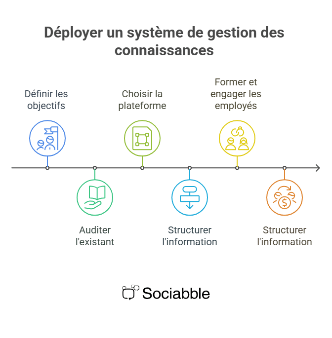 La connaissance pourrait devenir votre meilleur atout de performance. Car la gestion des connaissances est aujourd’hui crucial pour assurer la compétitivité, l’innovation et la pérennité des organisations. Chaque semaine, les employés passent jusqu’à 30% de leur temps à rechercher des informations qu’ils possèdent déjà quelque part. Cela représente près d’une journée et demie perdue à fouiller dans les e-mails, les discussions ou les dossiers obsolètes. Face à la vitesse de circulation de l’information et à l’évolution constante des données, il devient indispensable d’agir rapidement pour éviter la perte de temps et optimiser l’efficacité. Ce manque d’organisation ne fait pas qu’entraver la productivité : il épuise les équipes, ralentit la prise de décision et fragilise la collaboration. Dans cet article, nous verrons : ce qu’est un KMS et à quoi il sert, la définition des objectifs et les gains attendus, les bénéfices concrets qu’il apporte, les bonnes pratiques pour le mettre en place, et comment Sociabble aide les entreprises à rendre la connaissance accessible à tous, partout. La dispersion du savoir est un tueur silencieux de performance. Quand les données et informations sont éparpillées entre équipes, outils et supports personnels, l’entreprise perd non seulement du temps, mais aussi l’intelligence collective qui alimente l’innovation. Un système de gestion des connaissances, ou Knowledge Management System (KMS), ou encore logiciel de KM, vient résoudre ce problème. Il permet de capturer, structurer et partager la connaissance de l’entreprise pour que chacun puisse travailler plus vite, plus efficacement et plus intelligemment. Cet ce, qu’il s’agisse de procédures, de formations, d’analyses de marché ou de données clients. La mise en place d’une telle solution nécessite une approche méthodologique et des démarches structurées, afin de répondre aux problématiques spécifiques de l’organisation et d’assurer la cohérence des actions. Voyons tout cela en détail. Qu’est-ce qu’un Knowledge Management System (KMS) ? Un KMS est une plateforme numérique centralisée qui regroupe, organise et partage le savoir d’une entreprise pour en faciliter l’accès, l’utilisation et la réutilisation. Il garantit que toutes les informations essentielles (procédures, modes d’emploi, modes d’organisation, retours d’expérience, bonnes pratiques) soient disponibles pour tous les collaborateurs, quand ils en ont besoin. Un KMS permet de gérer différents types de connaissances (tacites, explicites) et d’usages, en s’adaptant aux besoins spécifiques de l’organisation. La distinction à connaître : La gestion des connaissances (KM) est la stratégie et les processus de gestion du savoir. Le système de gestion des connaissances est l’outil technologique, souvent sous forme de logiciel, qui rend cette stratégie opérationnelle. Imaginez un espace unique où les employés peuvent consulter des tutoriels, des documents de projet ou des guides via une vue claire et une interface graphique intuitive, sans devoir demander à leurs collègues : c’est exactement le rôle d’un KMS bien conçu. Le KMS s’inscrit dans la famille des systèmes de gestion, au même titre que les systèmes de gestion documentaire, de contenu ou de projet. Les bénéfices d’un système pour la gestion des connaissances Un bon système de knowledge management ne se contente pas de stocker des données : il transforme l’information en intelligence collective. Accès plus rapide à l’information Toutes les ressources sont centralisées, facilement consultables et actualisées. Les équipes gagnent du temps, réduisent les erreurs et prennent des décisions plus rapidement. Collaboration renforcée Un KMS brise les silos entre départements et connecte les collaborateurs, quel que soit leur lieu de travail. Les connaissances circulent librement, favorisant l’échange, l’entraide et l’innovation collective. Onboarding et formation facilités Les nouveaux arrivants peuvent se former immédiatement grâce à un accès direct aux procédures, aux supports de formation et aux bonnes pratiques. Résultat : un onboarding plus rapide et plus cohérent. Prise de décision éclairée Un accès simple à des informations fiables et à jour permet des décisions plus pertinentes et stratégiques à tous les niveaux de l’entreprise. Innovation accélérée Quand le savoir est partagé, la créativité s’épanouit. Les employés s’inspirent d’expériences variées et stimulent la transformation continue. Quels types de connaissances intégrer dans un KMS ? Un outils de gestion des connaissances efficace capture toutes les formes de savoir, formelles comme informelles : Connaissances explicites : documents, politiques internes, rapports, modèles, supports de formation. Connaissances tacites : savoir-faire et expériences partagées via témoignages, vidéos ou posts internes. Connaissances intégrées : informations incorporées dans les processus et outils (checklists, automatisations, guides). Connaissances procédurales : guides pas à pas, FAQ, instructions opérationnelles quotidiennes. Exemples d’outils de gestion des connaissances Les outils de gestion des connaissances peuvent prendre différentes formes : Outils traditionnels : SharePoint, Confluence, Google Workspace… Ils stockent et partagent des documents, mais restent souvent limités à la collaboration basique. Solutions modernes : des plateformes intégrées combinant communication, apprentissage et IA. C’est le cas de Sociabble, qui centralise toutes les ressources internes dans un espace unique d’intranet moderne, que ce soit sur web, mobile ou intégré à Microsoft Teams. Les employés y trouvent rapidement l’information dont ils ont besoin et peuvent contribuer à enrichir la base de connaissances commune. Bonnes pratiques pour u
