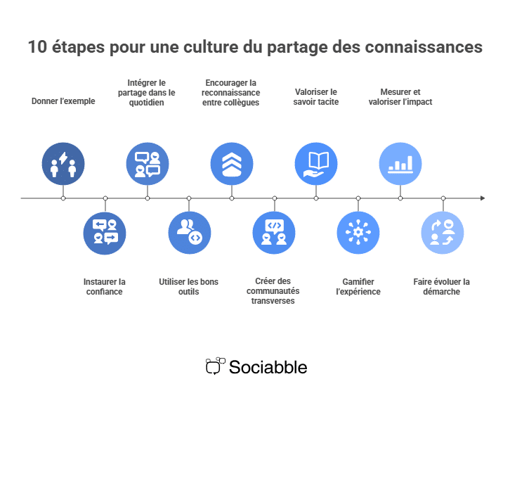 Chaque entreprise détient une véritable mine d’or : l’expertise de ses collaborateurs. Pourtant, une grande partie de ce savoir disparaît lorsque les employés changent d’équipe, de poste ou quittent l’entreprise. Le problème ne vient pas d’un manque d’informations, mais du fait que les connaissances précieuses restent souvent enfermées dans les têtes, au lieu d’être partagées au bénéfice de tous. Sans une culture de partage des connaissances, les équipes réinventent sans cesse la roue, reproduisent les mêmes erreurs et freinent l’innovation. Résultat : perte de temps, d’opportunités et de potentiel collectif. Dans cet article, découvrez ce qu’est une culture du partage des connaissances, pourquoi elle est déterminante dans la réussite des organisations, et 10 étapes concrètes pour l’ancrer durablement dans votre entreprise. lture really means, explain why it’s essential to organizational success, and outline ten practical steps to help your company make it part of everyday work. Qu’est-ce qu’une culture du partage des connaissances ? Une culture du partage des connaissances se définit par un environnement où les collaborateurs échangent naturellement leurs idées, leurs bonnes pratiques et leurs retours d’expérience, quel que soit leur service, leur niveau hiérarchique ou leur localisation. Il ne s’agit pas simplement de déposer des fichiers sur un espace partagé : c’est une dynamique sociale et continue qui favorise la collaboration et l’apprentissage collectif. Quand le partage devient une habitude, la connaissance n’est plus figée : elle évolue, s’enrichit et se diffuse en temps réel. Des checklists d’onboarding aux bilans de projets, chaque apprentissage devient une ressource accessible à tous. Cette approche transforme le savoir individuel en intelligence collective, où chaque empoyé contribue activement à la réussite globale de l’entreprise. Partage des connaissances vs gestion des connaissances Les termes sont proches, mais les concepts diffèrent : La gestion des connaissances (knowledge management) repose sur les outils et les systèmes : organiser, structurer et stocker les informations. Le partage des connaissances (knowledge sharing), lui, repose sur les personnes : leur curiosité, leur envie de transmettre et la confiance qu’elles accordent à leurs pairs. L’un ne fonctionne pas sans l’autre : les outils donnent la structure, mais les collaborateurs lui donnent vie. Sans participation active, même le meilleur système de gestion des connaissances reste une coquille vide. Pourquoi créer une culture du partage des connaissances ? Les organisations qui favorisent le partage des savoirs apprennent plus vite, innovent davantage et renforcent l’engagement de leurs collaborateurs. Quand l’information circule librement, les équipes travaillent mieux ensemble et les nouveaux arrivants s’intègrent plus rapidement. Selon une étude Harvard Business Review, les entreprises dotées de flux de connaissances solides affichent une productivité plus élevée et une satisfaction collaborateur accrue. Le partage des connaissances rend également les entreprises plus agiles : dans un environnement mouvant, celles capables de transformer rapidement les idées en actions gardent toujours une longueur d’avance. Les bénéfices d’une culture du partage des connaissances au sein d’une entreprise Apprentissage accéléré et onboarding simplifié : les nouveaux collaborateurs trouvent rapidement les bonnes informations. Moins d’erreurs et de doublons : les leçons apprises sont diffusées à l’ensemble des équipes. Plus d’innovation et de créativité : le croisement des idées stimule la réflexion et la résolution de problèmes. Engagement renforcé : les employés se sentent écoutés et utiles. Culture d’entreprise solide : la transparence nourrit la confiance et le sentiment d’appartenance. De nombreuses organisations découvrent que le partage des connaissances devient un pilier de l’engagement des employés, renforçant leur sentiment d’appartenance et leur contribution. Les freins au partage des connaissances Pourquoi, malgré ses avantages, le partage des connaissances reste-t-il rare ? Les freins sont souvent invisibles : peur du jugement, manque de confiance, silos internes ou encore outils inadaptés. Créer un climat de sécurité psychologique est fondamental : quand les collaborateurs savent que leurs idées seront respectées, ils osent davantage les partager. Le rôle du management est déterminant : des leaders transparents et ouverts montrent l’exemple et rendent le partage naturel. Découvrez également:Comment combler les distances de communication dans ses secteurs médicaux – Le cas d’Intech 10 étapes pour instaurer une culture du partage des connaissances 1. Montrer l’exemple Le partage commence par le haut. Quand les dirigeants communiquent ouvertement sur leurs apprentissages et leurs réussites, ils montrent que la transparence est une valeur clé. Aussi,des réunions d’information régulières avec l’ensemble du personnel ou des séances ouvertes de questions-réponses favorisent également le partage des connaissances entre les employés. Lorsque les dirigeants communiquent de manière authentique, les autres suivent. Le partage des connaissances doit avant tout être authentique. 2. Instaurer la confiance Le partage des connaissances s’épanouit dans des environnements où les gens se sentent en sécurité pour s’exprimer. Encouragez le dialogue ouvert, célébrez la curiosité et considérez les erreurs comme des occasions d’apprendre. Les employés qui se sentent soutenus contribueront plus volontiers aux connaissances collectives de l’ensemble de l’organisation. Lorsqu’il s’agit de construire une culture d’entreprise, la confiance est le ciment invisible qui maintient un engagement fort. 3. Intégrer et favoriser le par
