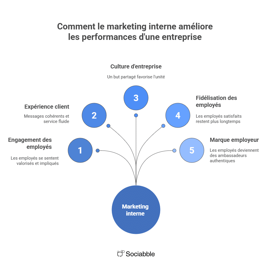 Toutes les entreprises parlent d’expérience client, mais peu réalisent qu’elle commence bien avant la première interaction entre un client et la marque. Elle démarre en interne, avec des employés engagés. Et tout commence par une stratégie de marketing interne efficace. Lorsqu’un programme de marketing interne est absent, les équipes ne saisissent pas pleinement ce que représente la marque. Ce manque de compréhension se reflète rapidement dans le service client, la fidélisation et la réputation. Dans ce guide, nous expliquons l’importance du marketing interne pour une entreprise et comment l’appliquer concrètement. Vous y trouverez des stratégies pratiques pour vos équipes marketing, des exemples réels et des idées actionnables pour aligner vos collaborateurs sur votre mission. C’est ainsi que vous pourrez transformer vos employés engagés en véritables ambassadeurs de marque. Qu’est-ce que le marketing interne ? Le marketing interne consiste à promouvoir la mission, les valeurs et la culture d’entreprise auprès de ses propres collaborateurs. Autrement dit, il s’agit de considérer les employés comme une audience stratégique à informer, inspirer et impliquer, avant même de lancer toute campagne externe. Son objectif : faire en sorte que chaque membre de l’organisation comprenne et adhère à la promesse de marque. Au cœur du marketing interne se trouve la cohérence de marque de l’intérieur vers l’extérieur. Quand chaque employé incarne les valeurs de l’entreprise et soutient sa mission, cela se ressent dans chaque interaction client, chaque lancement de produit et chaque communication. Cet alignement transforme la culture d’entreprise en véritable avantage concurrentiel. Le marketing interne, c’est le “pourquoi” derrière l’engagement. Il donne aux collaborateurs plus que des tâches à accomplir : une raison d’y croire, un but commun qui soutient la stratégie globale de l’entreprise. Le rôle clé de la communication interne et du management Le management et la communication interne jouent un rôle central dans la diffusion des valeurs et l’engagement des salariés. En facilitant la circulation de l’information et la cohésion des équipes, ils favorisent l’adhésion à la culture d’une entreprise entreprise et renforcent le sentiment d’appartenance. La réussite du marketing interne repose donc sur une gouvernance qui valorise les collaborateurs, promeut un environnement de travail positif et incarne les principes défendus. Le comportement des leaders et des managers, la reconnaissance du travail accompli et le respect des valeurs fondamentales constituent les fondations d’un engagement durable et authentique. En quoi le marketing interne diffère-t-il du marketing externe ? Beaucoup d’entreprises excellent dans le marketing externe, mais oublient qu’il ne peut fonctionner que si le marketing interne passe avant. Les deux approches utilisent des outils similaires (storytelling, branding, communication), mais leurs cibles et objectifs diffèrent profondément. Un ensemble d’outils et de méthodes est disponible pour la communication interne, incluant l’intranet, la publication d’articles sur l’intranet, et l’utilisation du réseau social d’entreprise pour relayer des messages, partager des ressources et renforcer la relation avec les collaborateurs. Élément Marketing externe Marketing interne Audience Les clients Les employés (vos “clients internes”) Objectif Vendre Engager, aligner et inspirer Outils Publicité, réseaux sociaux, relations presse Plateformes de communication interne, newsletters, vidéos, programmes de reconnaissance, intranet, articles, réseau social interne Les deux sont pourtant interdépendants. Si vos collaborateurs ne sont pas convaincus par votre histoire de marque, vos clients ne le seront pas non plus. Une communication interne solide garantit que chaque campagne externe a déjà été adoptée en interne. L’efficacité de la communication interne repose sur la combinaison de cet ensemble d’outils et de méthodes avec d’autres moyens adaptés à chaque organisation. Les bénéfices d’implémenter une stratégie de marketing interne Un bon marketing interne crée un impact à la fois humain et business. Quand les employés se sentent connectés à la mission de leur entreprise, tout s’améliore : productivité, satisfaction client, rétention, réputation. La qualité de la communication interne et la mise en place de projets structurants sont clés pour garantir ces résultats. Voici les principaux avantages : Engagement des employés Les collaborateurs qui comprennent la vision de l’entreprise se sentent valorisés, informés et impliqués. Ils participent plus activement et proposent davantage d’idées. Meilleure expérience client Des équipes alignées délivrent des messages cohérents et un service fluide, créant un parcours client homogène et renforçant la fidélité à long terme. Culture d’entreprise renforcée Un but partagé, véhiculé par le marketing interne, favorise l’unité et l’appartenance, fondement d’une culture résiliente. Fidélisation accrue Des employés satisfaits restent plus longtemps. Lorsqu’ils se sentent connectés à la direction de l’entreprise et reconnus pour leurs efforts, la rétention augmente naturellement. D’ailleurs, dans ce cas, on pourrait même parler de marketing RH : ne approche marketing de la marque employeur permet aux ressources humaines d’attirer, engager et fidéliser les talents en valorisant l’expérience collaborateur. À l’image du principe du marketing externe, la fidélisation des employés repose sur les mêmes fondamentaux que celle des clients. Marque employeur plus forte La fierté interne devient un moteur d’attractivité. Les collaborateurs deviennent des ambassadeurs authentiques, partageant des récits qui renforcent votre réputation et attirent l